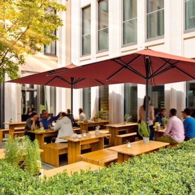- Individuelle Anpassung & Gestaltung – Große Auswahl an Farben, Stoffen und Design‑Varianten; außerdem optionale Extras wie Heizstrahler oder LED‑Beleuchtung — so lässt sich der Außenbereich exakt an Corporate Design oder Wunschambiente anpassen.