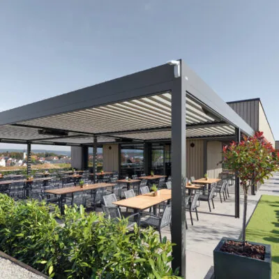 Für Hotels, die ihre Gäste mit einer eleganten und komfortablen Außenlounge beeindrucken wollen, sind unsere Gastro-Markisen, Sonnenschirme oder Lamellendächer ideal. Diese Lösungen bieten nicht nur Schutz, sondern auch ein visuell ansprechendes Element, das das Gesamterlebnis aufwertet.